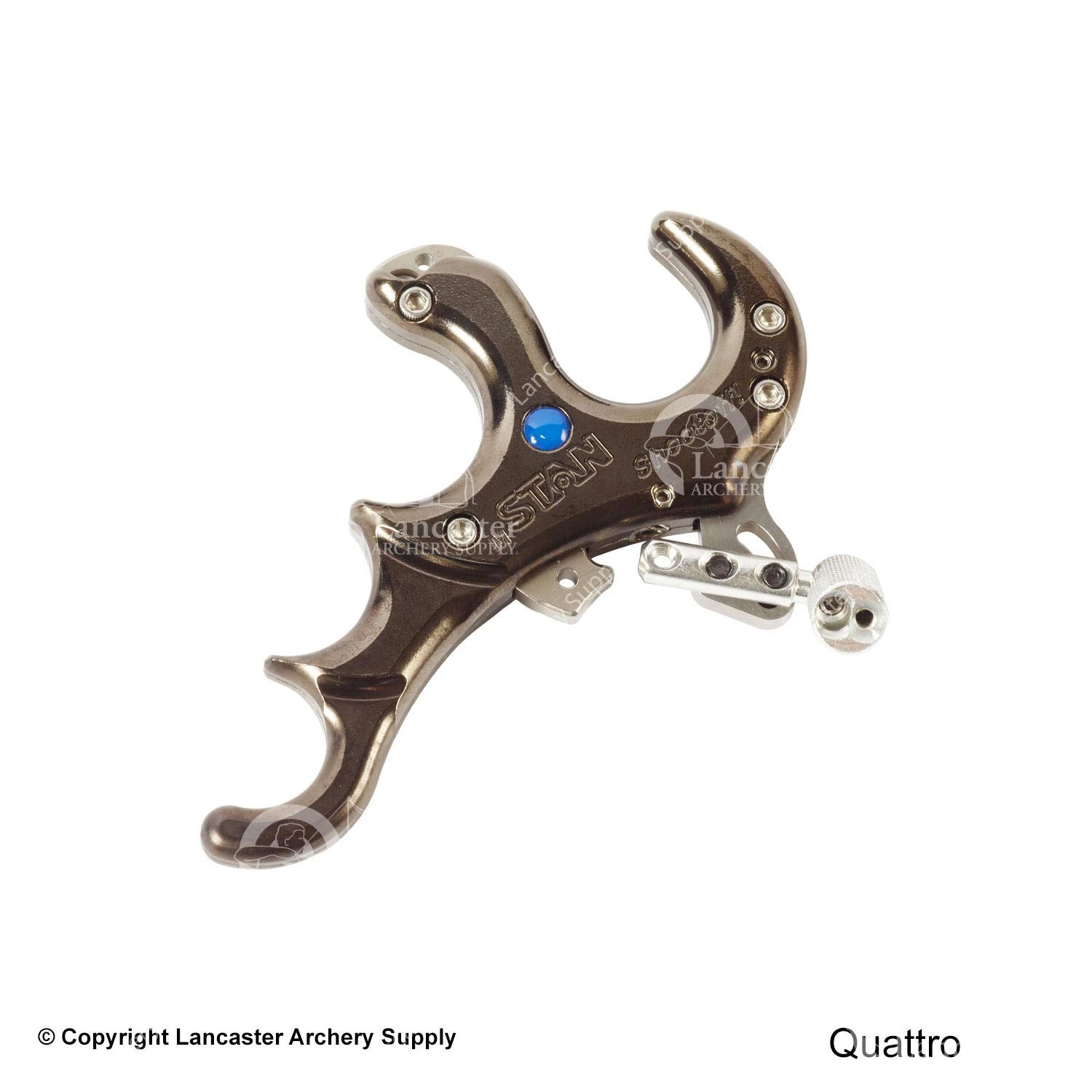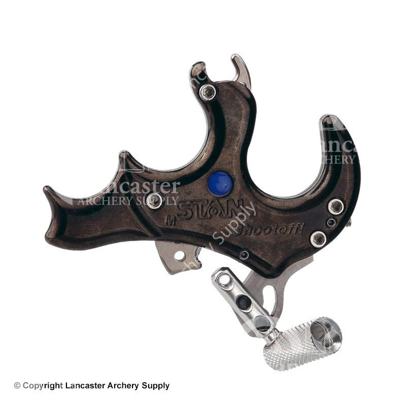 Here’s the wildly popular Stan Shootoff with a copper handle. That means it’s heavy, which some archers prefer in order to improve their control over the release. They get a better feel for the heavy release in their hands. This thumb-activated release includes the new training lock, which means archers can practice with it on their bows without releasing the string.